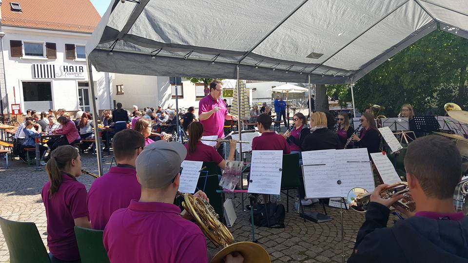 Sommersaison hat begonnen Das große Blasorchester hatte am Vatertag bei den Musikerfreunden aus Kirrlach seinen ersten Freiluftauftritt in dieser Saison. Wie schon in den vergangenen Jahren spielte das Orchester unter Leitung seiner Dirigentin Sabine Knebel zum Frühschoppen vor dem alten Kirrlacher Rathaus. Trotz der recht kühlen Witterung in der Morgenstunde konnte das Programm der Wiesentaler Musiker einige Gäste anlocken. Zum Ende unseres Auftrittes waren alle Tische besetzt und wir erhielten mit dem mächtigen Beifall den gebührenden Lohn für unsere Darbietungen. Wir freuen uns, dass wir uns mit den Kirrlacher Musikern so engagiert haben, dass diese bei uns zum Maifest spielen und wir uns dann bei ihnen am Vatertag revanchieren können.