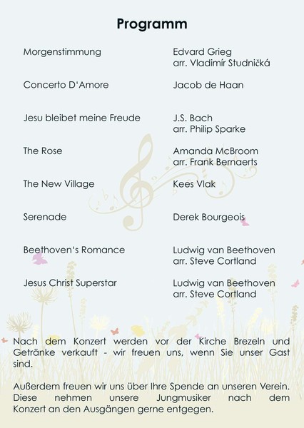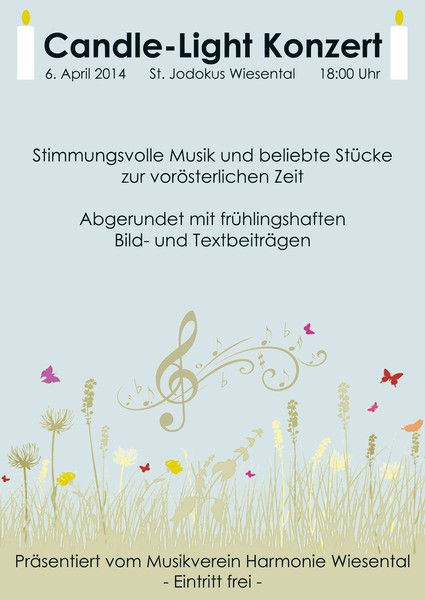Candle-Light-Konzert Am Sonntag 6.April um 18 Uhr gibt der Musikverein ein Konzert in der katholischen Pfarrkirche St. Jodokus in Wiesental.Wir bieten "stimmungsvolle Musik abgerundet mit frühlingshaften Bild- und Textbeiträgen". Der Eintritt ist frei.
