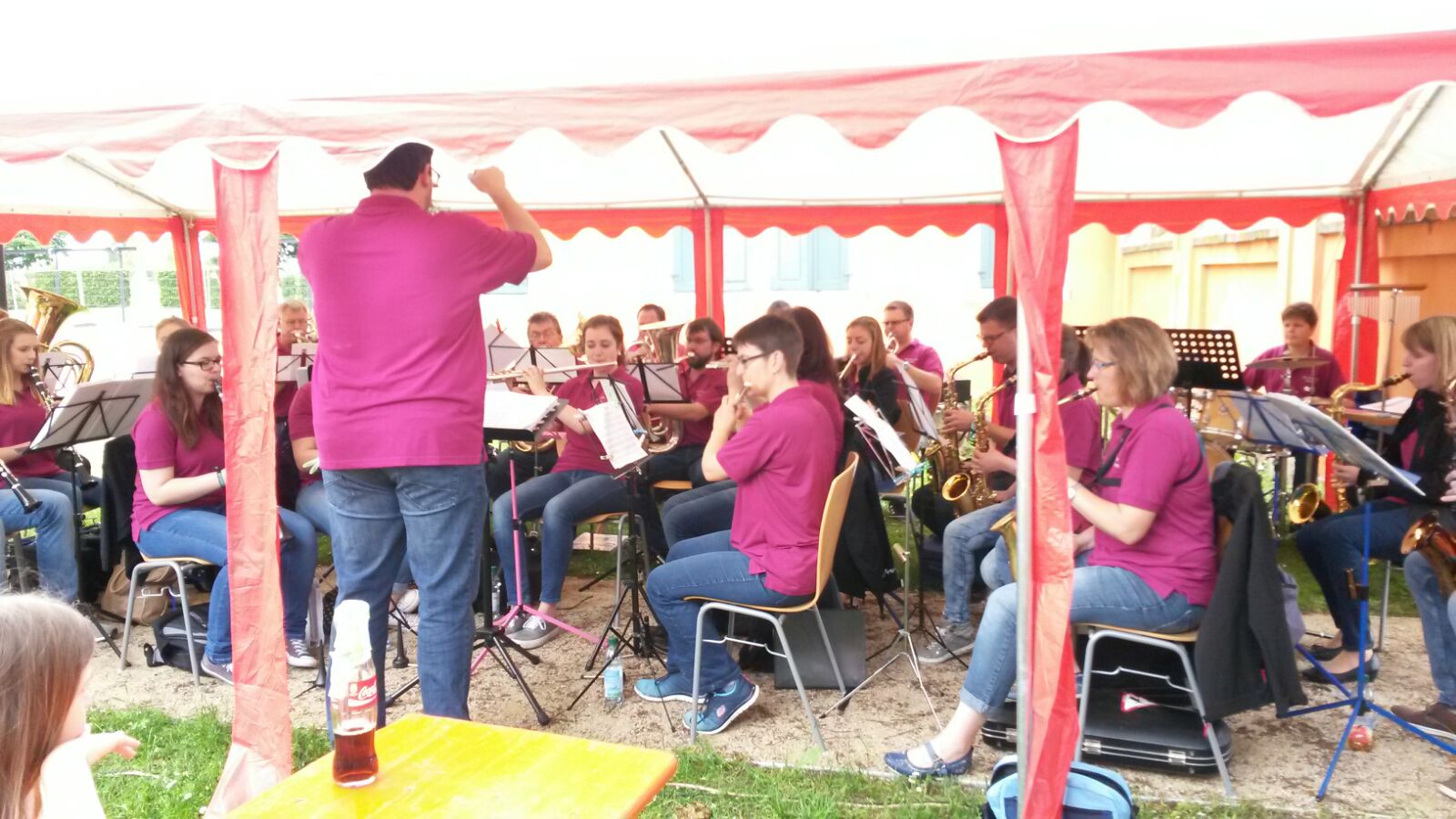 Bezirksmusikfest in Lieolsheim Das Blasorchester der „Harmonie“ hatte seinen Auftritt beim Bezirksmusikfest in Liedolsheim zum Freundschaftsspielen im voll besetzten Festzelt. Hier mussten wir uns etwas besonderes einfallen lassen, denn unsere Vorgänger auf der Bühnen war eine Gastkapelle aus Österreich „Bad Hall“. Deren Dirigent hüpfte wie ein Stehaufmännchen durch das Zelt und animierte das Publikum durch Sprüche, Gesang und Gymnastikübungen. Doch Sabine Knebel stellte das Programm zusammen und traf genau den Geschmack der Festgäste, sodass auch wir beim Publikum genauso gut ankamen.