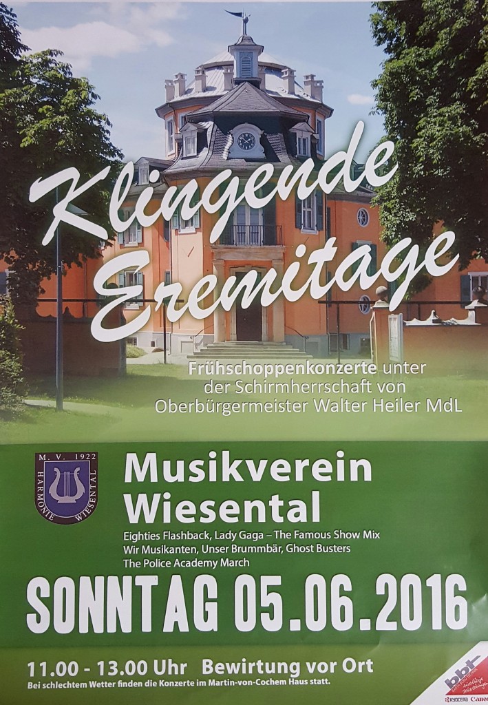 Klingende Eremitage Im Rahmen der Sonntagsvormittagskonzerte zur „Klindenden Eremitage“ laden wir heute schon die ganze Bevölkerung ein. Der Musikverein „Harmonie“ Wiesental gestaltet den Termin am Sonntag, 17.Juli 2012. Die Musik spielt von 11 – 13 Uhr. Bei dieser Matinee zeigt sich neben dem Blasorchester auch das neuformierte Jugendorchester. Für das leibliche Wohl ist bestens gesorgt.