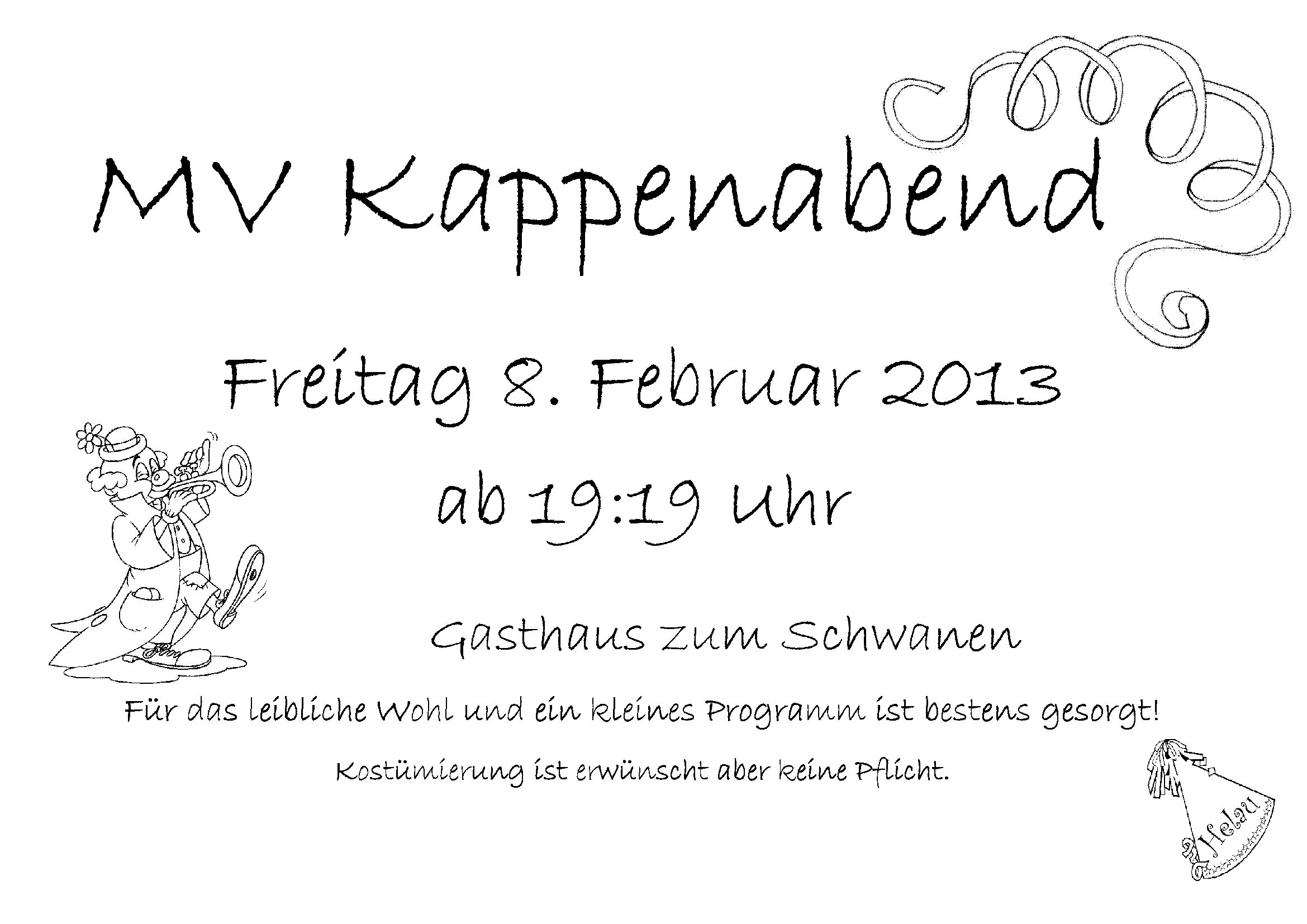 Liebe Musiker, liebe Freunde und Gönner, der Musikverein Harmonie Wiesental veranstaltet in diesem Jahr einen Kappenabend ganz speziell für EUCH. Los gehts ab 19:19 Uhr am Freitag, den 8. Februar 2013 im Gasthaus zum Schwanen in Wiesental. Also packt eure(n) Partnerin, Ehemann, Geliebte, Freund, Kind und Hund (nur mit 2 Beinen)ein und feiert gemeinsam mit uns die 5. Jahreszeit.