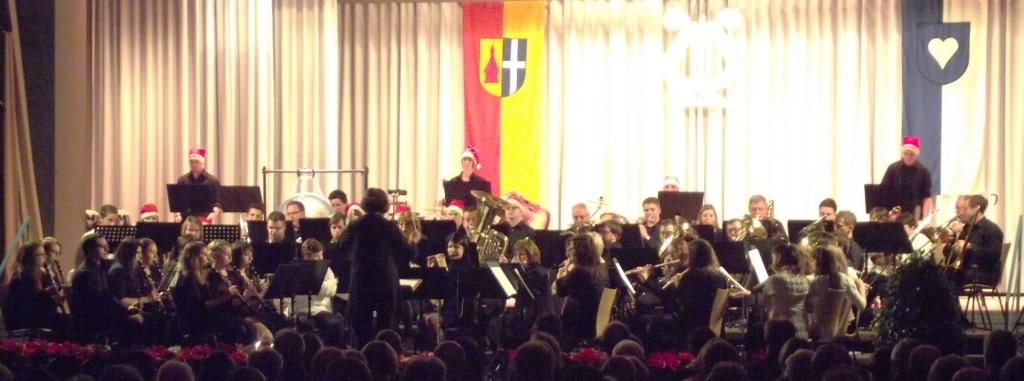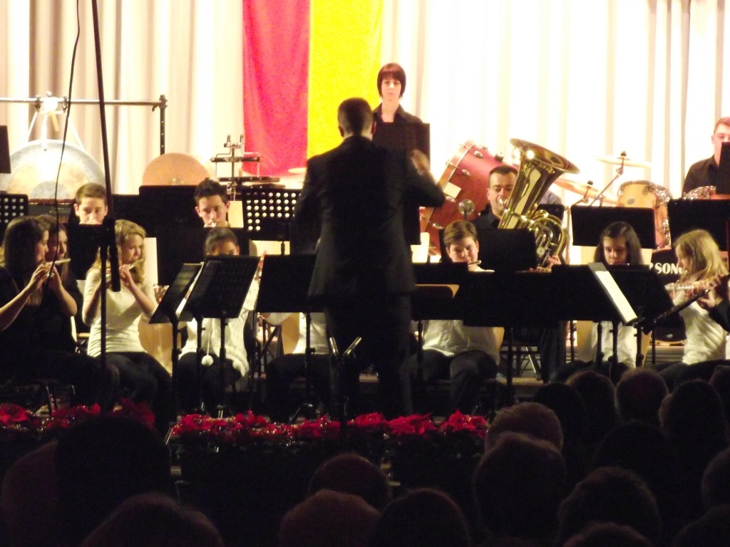 38. Adventskonzert am 1. Dezember 2013 Grandioses Adventskonzert in der Wagbachhalle Gut im Griff hatte Dirigentin Sabine Knebel die 48 Musikerinnen und Musiker beim Wiesentaler Adventskonzert. Vor 38 Jahren war es der damalige Dirigent des Musikvereins Harrnonie Wiesental, Manfred Keller, der kurz vor Weihnachten erstmals zu einem Adventskonzert einlud. Seitdem bietet der erste Sonntag im Dezember immer einen Höhepunkt konzertanter Blasmusik im Waghäuseler Stadtteil. Seit mittlerweile zehn Jahren schwingt Manfred Kellers Tochter Sabine Knebel den Dirigentenstab. Und beim diesjährigen Konzert übernahm Felix Knebel, Enkel von Manfred Keller, zum ersten Mal die Leitung des Jugendorchesters. Für den ersten Vorsitzenden Michael Zimmermann ist diese Kontinuität bei der musikalischen Leitung Garant für die hohe Qualität des Wiesentaler Orchesters. Davon konnten sich am ersten Advent weit mehr als 400 Besucher, darunter auch Oberbürgermeister Walter Heiler, MdL, in der gut gefüllten Wagbachhalle überzeugen. Geboten wurde bei dieser „musikalischen Reise um die Welt“ ein Konzert von hoher Qualität. Das 48-köpfige Orchester mit einem Durchschnittsalter von 29 Jahren bot eine klangvolle Symbiose aus jungen, aufstrebenden Musikern, darunter vielen Mädchen sowie einem halben Dutzend erfahrenen Blechbläsern. Dankbar registriert wurde von den begeisterten Konzert-Besuchern auch die solide und kompetente Ausbildung durch die Musikschule Waghäusel-Hambrücken. Jugendleiterin Anja Köhler führte gekonnt durch ein großartiges Programm. Die musikalische Weltreise begann mit dem „Einzug der Gäste auf der Wartburg“ aus der Oper Tannhäuser. Die „Elisabeth-Serenade“ entführte die Zuhörer nach England, ehe es mit dem Titel „Pilatus-Mountain of Dragons“ in die Schweizer Bergwelt ging. Rhythmische Spielereien mit einem lyrischen Mittelteil bot das Stück „Flashing Winds“ von Jan van der Roost. Die ausgefallene und gewitzte Instrumentation des russischen Komponisten Dimitri Dmitrijewitsch Schostakowitsch beförderte den sowjetischen Jazz auf ein professionelles Niveau. Nach der Pause präsentierten die Jungmusiker mit „Pioneer Spin“ und „Rock for Kids“ ihr Können. Für einen Abstecher nach Rom sorgte die Filmmusik von „Gladiator“, ehe der von Elmer Bernstein komponierte Soundtrack „The Magnificent Seven“ die Musikliebhaber in ein mexikanisches Dorf entführte. Danach ging es mit „The Peanut Vendor“ weiter nach Kuba, wobei hier vor allem das Schlagwerk gefordert war. Beendet wurde das grandiose 38. Adventskonzert des Musikvereins Wiesental mit mehreren Zugaben und vorweihnachtlichen Klängen. Kurt Klumpp
